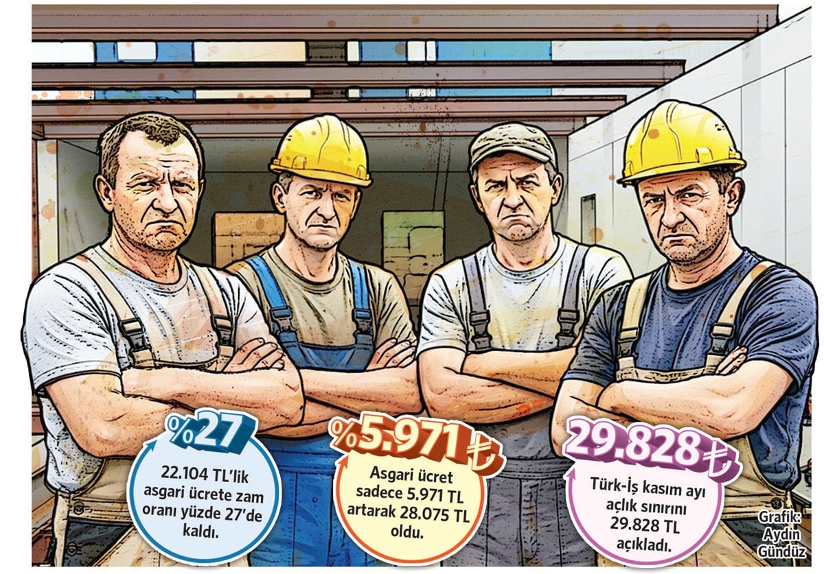 Pazarlık masasına işverenle oturan iktidar, 2026 yılı asgari ücretine yalnızca yüzde 27 zam yaptı. 22 bin 104 lira olan net asgari ücret, zammın ardından 1 Ocak 2026 tarihi itibarıyla 28 bin 75 TL’de kalacak. Brüt asgari ücret ise yeni yıldan itibaren 33 bin 30 lira oldu. Milyonlarca asgari ücretli yeni yıla açlık sınırının da altında maaşlarla başlayacak.