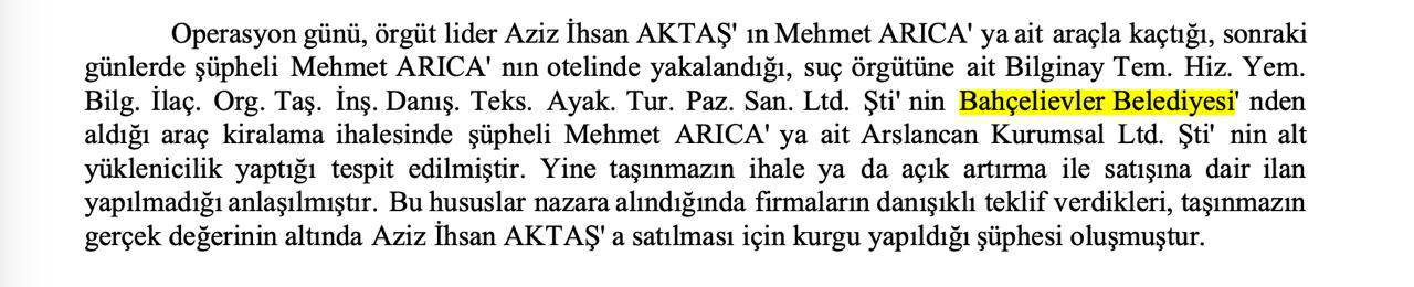 Birçok şüphelinin ifadelerinde geçen firmayla ilgili iddianamede, şu tespitlere yer verildi: “Operasyon günü, örgüt lideri Aziz İhsan Aktaş’ın Mehmet Arıca’ya ait araçla kaçtığı, sonraki günlerde Mehmet Arıca’nın otelinde yakalandığı, suç örgütüne ait Bilginay Tem. Hiz. Yem. Bilg. İlaç. Org. Taş. İnş. Danış. Teks. Ayak. Tur. Paz. San. Ltd. Şti’nin Bahçelievler Belediyesi’nden aldığı araç kiralama ihalesinde Mehmet Arıca’ya ait Arslancan Kurumsal Ltd. Şti’nin alt yüklenicilik yaptığı tespit edilmiştir. Ayrıca taşınmazın ihale ya da açık artırma ile satışına dair ilan yapılmadığı anlaşılmıştır. Bu durumlar göz önüne alındığında, firmaların danışıklı teklif verdikleri, taşınmazın gerçek değerinin altında Aziz İhsan Aktaş’a satılması için kurgu yapıldığı şüphesi oluşmuştur.”